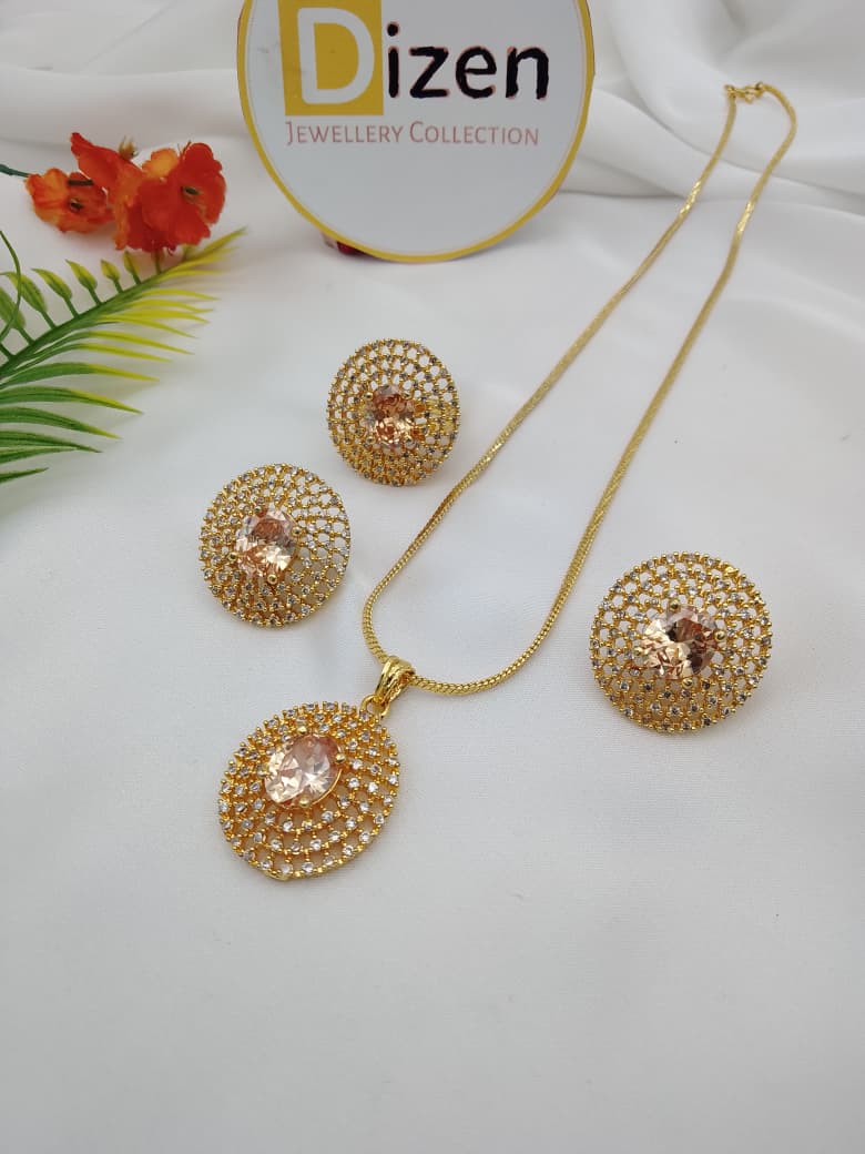 This elegant Indian combo set features a beautifully crafted gold-plated pendant with a matching pair of round studs. The intricate design is adorned with shimmering stones, centered with a sparkling peach-toned gem that adds a touch of sophistication. The pendant hangs gracefully on a sleek golden chain, making it versatile for both traditional and modern outfits. The earrings, designed with the same detailed craftsmanship, complete the set with a timeless charm.