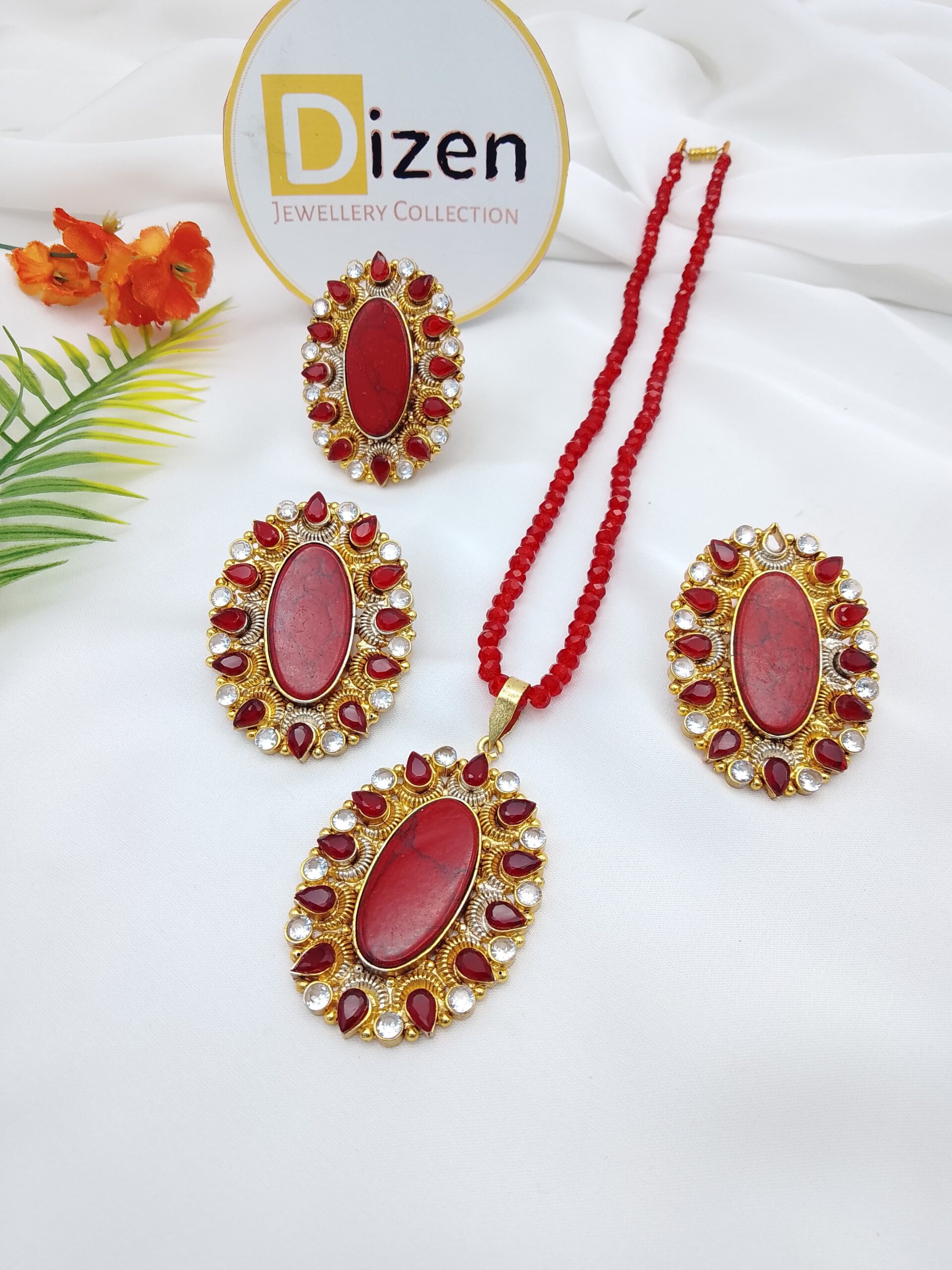 This elegant Jewellery combo set includes a striking red & black beaded chain with a large oval pendant and a matching pair of statement earrings. Each piece is beautifully crafted with a bold red stone at the center, surrounded by teardrop red and black gems and sparkling white stones, all set in a golden base. The intricate detailing and vibrant color combination give it a royal and traditional appeal, making it a perfect choice for weddings, festive occasions, and cultural events.
